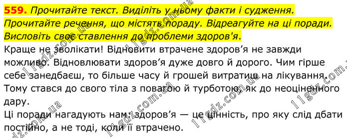 Прочитайте текст. Виділіть у ньому факти і судження. Прочитайте речення, що містять пораду. Відреагуйте на ці поради. Висловіть своє ставлення до проблеми здоров'я. Краще не зволікати! Відновити втрачене здоров’я не завжди можливо. Відновлювати здоров’я дуже довго й дорого. Чим гірше себе занедбаєш, то більше часу й грошей витратиш на лікування. Тому стався до свого тіла з повагою й турботою, як до неоціненного дару. Ці поради нагадують нам: здоров’я — це цінність, про яку слід дбати постійно, а не тоді, коли її втрачено.