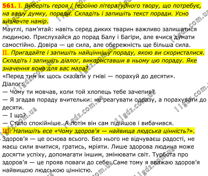 І. Виберіть героя / героїню літературного твору, що потребує, на вашу думку, поради. Складіть і запишіть текст поради. Усно визначте намір. Мауглі, пам’ятай: навіть серед диких тварин важливо залишатися людиною. Прислухайся до порад Балу і Багіри, але вчися думати самостійно. Довіра — це сила, але обережність ще більша сила. ІІ. Пригадайте і запишіть найціннішу пораду, якою ви скористалися. Складіть і запишіть діалог, використавши в ньому цю пораду. Яке значення вона для вас мала? «Перед тим як щось сказати у гніві — порахуй до десяти». Діалог: — Чому ти мовчав, коли той хлопець тебе зачепив? — Я згадав пораду вчительки: не реагувати одразу, а порахувати до десяти. — І що? — Стало спокійніше. А потім він сам підійшов і вибачився. ІІІ. Напишіть есе «Чому здоров'я — найвища людська цінність?». Здоров’я — це основа всього. Без нього не відчуваєш радості, не маєш сили вчитися, гратись, мріяти. Лише здорова людина може досягти успіху, допомагати іншим, змінювати світ. Турбота про здоров’я — це прояв поваги до себе. Саме тому я вважаю здоров’я найвищою людською цінністю.