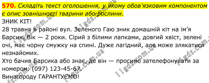 Складіть текст оголошення, у якому обов'язковим компонентом є опис зовнішності тварини або рослини. ЗНИК КІТ! 28 травня в районі вул. Зеленого Гаю зник домашній кіт на ім’я Барсик. Вік — 2 роки. Сірий з білими лапками, довгий хвіст, зелені очі, має чорну смужку на спині. Дуже лагідний, але може злякатися незнайомих. Хто бачив Барсика або знає, де він — просимо зателефонувати за номером: (097) 123-45-67. Винагороду ГАРАНТУЄМО!