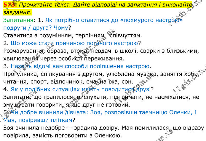 Прочитайте текст. Дайте відповіді на запитання і виконайте завдання. Запитання: 1. Як потрібно ставитися до «похмурого настрою» подруги / друга? Чому? Ставитися з розумінням, терпінням і співчуттям. 2. Що може стати причиною поганого настрою? Розчарування, образа, втома, невдачі в школі, сварки з близькими, хвилювання через особисті переживання. 3. Назвіть відомі вам способи поліпшення настрою. Прогулянка, спілкування з другом, улюблена музика, заняття хобі, читання, спорт, відпочинок, смачна їжа, сон. 4. Як у подібних ситуаціях мають поводитися друзі? Запитати, що трапилося, вислухати, підтримати, не насміхатися, не змушувати говорити, якщо друг не готовий. 5. Чи добре вчинили дівчата: Зоя, розповівши таємницю Оленки, і Мая, повіривши пліткам? Зоя вчинила недобре — зрадила довіру. Мая помилилася, що відразу повірила, замість поговорити з Оленкою.