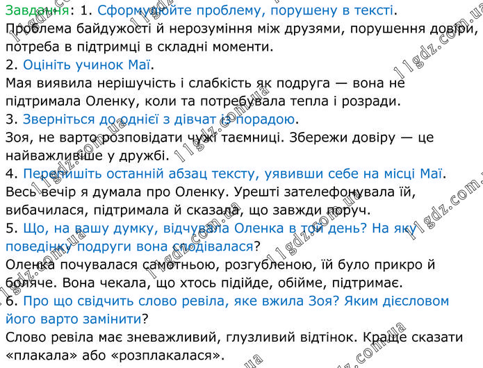Завдання: 1. Сформулюйте проблему, порушену в тексті. Проблема байдужості й нерозуміння між друзями, порушення довіри, потреба в підтримці в складні моменти. 2. Оцініть учинок Маї. Мая виявила нерішучість і слабкість як подруга — вона не підтримала Оленку, коли та потребувала тепла і розради. 3. Зверніться до однієї з дівчат із порадою. Зоя, не варто розповідати чужі таємниці. Збережи довіру — це найважливіше у дружбі. 4. Перепишіть останній абзац тексту, уявивши себе на місці Маї. Весь вечір я думала про Оленку. Урешті зателефонувала їй, вибачилася, підтримала й сказала, що завжди поруч. 5. Що, на вашу думку, відчувала Оленка в той день? На яку поведінку подруги вона сподівалася? Оленка почувалася самотньою, розгубленою, їй було прикро й боляче. Вона чекала, що хтось підійде, обійме, підтримає. 6. Про що свідчить слово ревіла, яке вжила Зоя? Яким дієсловом його варто замінити? Слово ревіла має зневажливий, глузливий відтінок. Краще сказати «плакала» або «розплакалася».