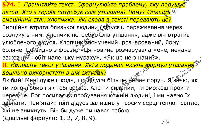 І. Прочитайте текст. Сформулюйте проблему, яку порушує автор. Хто з героїв потребує слів утішання? Чому? Опишіть емоційний стан хлопчика. Які слова в тексті передають це? Емоційна втрата близької людини (дідуся), переживання через розлуку з ним. Хлопчик потребує слів утішання, адже він втратив улюбленого дідуся. Хлопчик засмучений, розчарований, йому боляче. Це видно з фрази: «Ця новина розчарувала мене, неначе важезний чобіт маленьку мураху», «Як це не з нами?». ІІ. Напишіть текст утішання. Які з поданих нижче формул утішання доцільно використати в цій ситуації? Любий! Мені дуже шкода, що дідуся більше немає поруч. Я знаю, як ти його любив і як тобі важко. Але ти сильний, ти зможеш пройти через це. Бог посилає випробування кожній людині, і ми маємо їх здолати. Пам’ятай: твій дідусь залишив у твоєму серці тепло і світло, які не зникнуть. Він би дуже пишався тобою. (Доцільні формули: 1, 2, 7, 8, 9).