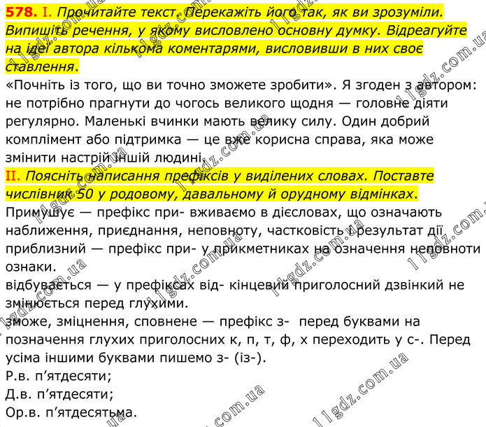 І. Прочитайте текст. Перекажіть його так, як ви зрозуміли. Випишіть речення, у якому висловлено основну думку. Відреагуйте на ідеї автора кількома коментарями, висловивши в них своє ставлення. «Почніть із того, що ви точно зможете зробити». Я згоден з автором: не потрібно прагнути до чогось великого щодня — головне діяти регулярно. Маленькі вчинки мають велику силу. Один добрий комплімент або підтримка — це вже корисна справа, яка може змінити настрій іншій людині. ІІ. Поясніть написання префіксів у виділених словах. Поставте числівник 50 у родовому, давальному й орудному відмінках. Примушує — префікс при- вживаємо в дієсловах, що означають наближення, приєднання, неповноту, частковість і результат дії приблизний — префікс при- у прикметниках на означення неповноти ознаки. відбувається — у префіксах від- кінцевий приголосний дзвінкий не змінюється перед глухими. зможе, зміцнення, сповнене — префікс з- перед буквами на позначення глухих приголосних к, п, т, ф, х переходить у с-. Перед усіма іншими буквами пишемо з- (із-). Р.в. п’ятдесяти; Д.в. п’ятдесяти; Ор.в. п’ятдесятьма.