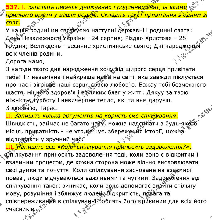І. Запишіть перелік державних і родинних свят, із якими прийнято вітати у вашій родині. Складіть текст привітання з одним зі свят. У нашій родині ми святкуємо наступні державні і родинні свята: День Незалежності України - 24 серпня; Різдво Христове – 25 грудня; Великдень - весняне християнське свято; Дні народження всіх членів родини. Дорога мамо, З нагоди твого дня народження хочу від щирого серця привітати тебе! Ти незамінна і найкраща мама на світі, яка завжди піклується про нас і зігріває наші серця своєю любов'ю. Бажау тобі безмежного щастя, міцного здоров'я і всіляких благ у житті. Дякуу за твою ніжність, турботу і невичерпне тепло, які ти нам даруєш. З любов'ю, Тарас. ІІ. Запишіть кілька аргументів на користь смс-спілкування. Швидкість, займає не багато часу, можна надсилати з будь-якого місця, приватність - не хто не чує, збереження історії, можна відповідати у зручний час. ІІІ. Напишіть есе «Коли спілкування приносить задоволення?». Спілкування приносить задоволення тоді, коли воно є відкритим і взаємним процесом, де кожна сторона може вільно висловлювати свої думки та почуття. Коли спілкування засноване на взаємної повазі, люди відчуваються важливими та чутими. Задоволення від спілкування також виникає, коли воно допомагає знайти спільну мову, розуміння і зближує людей. Відкритість, повага та співпереживання в спілкуванні роблять його приємним для всіх його учасників.