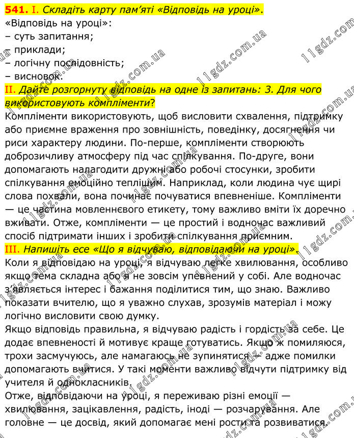 І. Складіть карту пам’яті «Відповідь на уроці». «Відповідь на уроці»: – суть запитання; – приклади; – логічну послідовність; – висновок. ІІ. Дайте розгорнуту відповідь на одне із запитань: 3. Для чого використовують компліменти? Компліменти використовують, щоб висловити схвалення, підтримку або приємне враження про зовнішність, поведінку, досягнення чи риси характеру людини. По-перше, компліменти створюють доброзичливу атмосферу під час спілкування. По-друге, вони допомагають налагодити дружні або робочі стосунки, зробити спілкування емоційно теплішим. Наприклад, коли людина чує щирі слова похвали, вона починає почуватися впевненіше. Компліменти — це частина мовленнєвого етикету, тому важливо вміти їх доречно вживати. Отже, компліменти — це простий і водночас важливий спосіб підтримати інших і зробити спілкування приємним. ІІІ. Напишіть есе «Що я відчуваю, відповідаючи на уроці». Коли я відповідаю на уроці, я відчуваю легке хвилювання, особливо якщо тема складна або я не зовсім упевнений у собі. Але водночас з’являється інтерес і бажання поділитися тим, що знаю. Важливо показати вчителю, що я уважно слухав, зрозумів матеріал і можу логічно висловити свою думку. Якщо відповідь правильна, я відчуваю радість і гордість за себе. Це додає впевненості й мотивує краще готуватись. Якщо ж помиляюся, трохи засмучуюсь, але намагаюсь не зупинятися — адже помилки допомагають вчитися. У такі моменти важливо відчути підтримку від учителя й однокласників. Отже, відповідаючи на уроці, я переживаю різні емоції — хвилювання, зацікавлення, радість, іноді — розчарування. Але головне — це досвід, який допомагає мені рости та розвиватися.