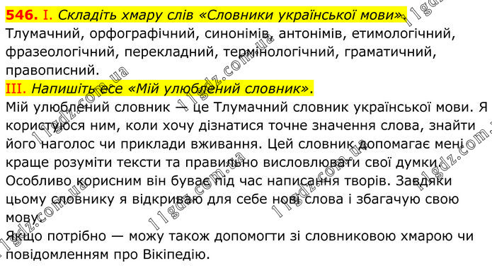 І. Складіть хмару слів «Словники української мови». Тлумачний, орфографічний, синонімів, антонімів, етимологічний, фразеологічний, перекладний, термінологічний, граматичний, правописний. ІІІ. Напишіть есе «Мій улюблений словник». Мій улюблений словник — це Тлумачний словник української мови. Я користуюся ним, коли хочу дізнатися точне значення слова, знайти його наголос чи приклади вживання. Цей словник допомагає мені краще розуміти тексти та правильно висловлювати свої думки. Особливо корисним він буває під час написання творів. Завдяки цьому словнику я відкриваю для себе нові слова і збагачую свою мову. Якщо потрібно — можу також допомогти зі словниковою хмарою чи повідомленням про Вікіпедію.