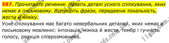 Прочитайте речення. Назвіть деталі усного спілкування, яких немає в письмовому. Відтворіть фрази, передаючи тональність, жести й міміку. Усне спілкування має багато невербальних деталей, яких немає в письмовому мовленні: інтонація, міміка й жести, тембр і гучність голосу, реакція співрозмовника.