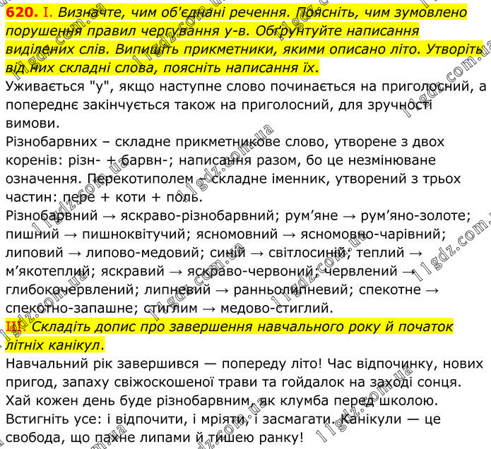 І. Визначте, чим об'єднані речення. Поясніть, чим зумовлено порушення правил чергування у-в. Обґрунтуйте написання виділених слів. Випишіть прикметники, якими описано літо. Утворіть від них складні слова, поясніть написання їх. Уживається "у", якщо наступне слово починається на приголосний, а попереднє закінчується також на приголосний, для зручності вимови. Різнобарвних – складне прикметникове слово, утворене з двох коренів: різн- + барвн-; написання разом, бо це незмінюване означення. Перекотиполем – складне іменник, утворений з трьох частин: пере + коти + поль. Різнобарвний → яскраво-різнобарвний; рум’яне → рум’яно-золоте; пишний → пишноквітучий; ясномовний → ясномовно-чарівний; липовий → липово-медовий; синій → світлосиній; теплий → м’якотеплий; яскравий → яскраво-червоний; червлений → глибокочервлений; липневий → ранньолипневий; спекотне → спекотно-запашне; стиглим → медово-стиглий. ІІІ. Складіть допис про завершення навчального року й початок літніх канікул. Навчальний рік завершився — попереду літо! Час відпочинку, нових пригод, запаху свіжоскошеної трави та гойдалок на заході сонця. Хай кожен день буде різнобарвним, як клумба перед школою. Встигніть усе: і відпочити, і мріяти, і засмагати. Канікули — це свобода, що пахне липами й тишею ранку!