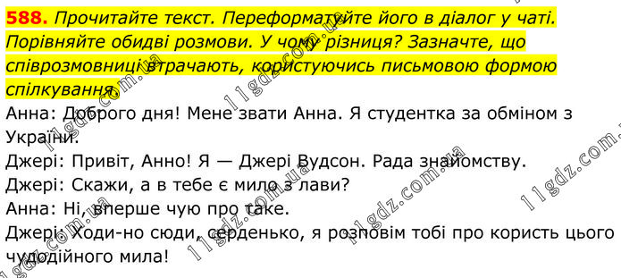 Прочитайте текст. Переформатуйте його в діалог у чаті. Порівняйте обидві розмови. У чому різниця? Зазначте, що співрозмовниці втрачають, користуючись письмовою формою спілкування. Анна: Доброго дня! Мене звати Анна. Я студентка за обміном з України. Джері: Привіт, Анно! Я — Джері Вудсон. Рада знайомству. Джері: Скажи, а в тебе є мило з лави? Анна: Ні, вперше чую про таке. Джері: Ходи-но сюди, серденько, я розповім тобі про користь цього чудодійного мила!