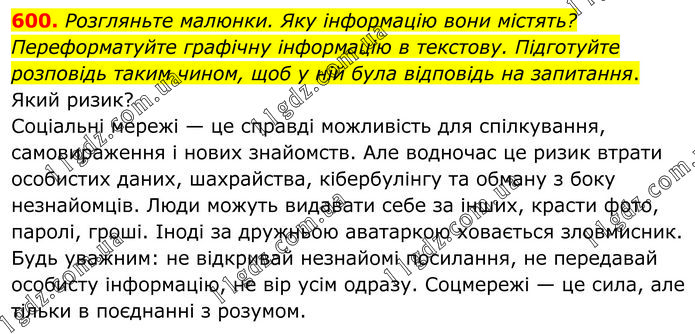Розгляньте малюнки. Яку інформацію вони містять? Переформатуйте графічну інформацію в текстову. Підготуйте розповідь таким чином, щоб у ній була відповідь на запитання. Який ризик? Соціальні мережі — це справді можливість для спілкування, самовираження і нових знайомств. Але водночас це ризик втрати особистих даних, шахрайства, кібербулінгу та обману з боку незнайомців. Люди можуть видавати себе за інших, красти фото, паролі, гроші. Іноді за дружньою аватаркою ховається зловмисник. Будь уважним: не відкривай незнайомі посилання, не передавай особисту інформацію, не вір усім одразу. Соцмережі — це сила, але тільки в поєднанні з розумом.
