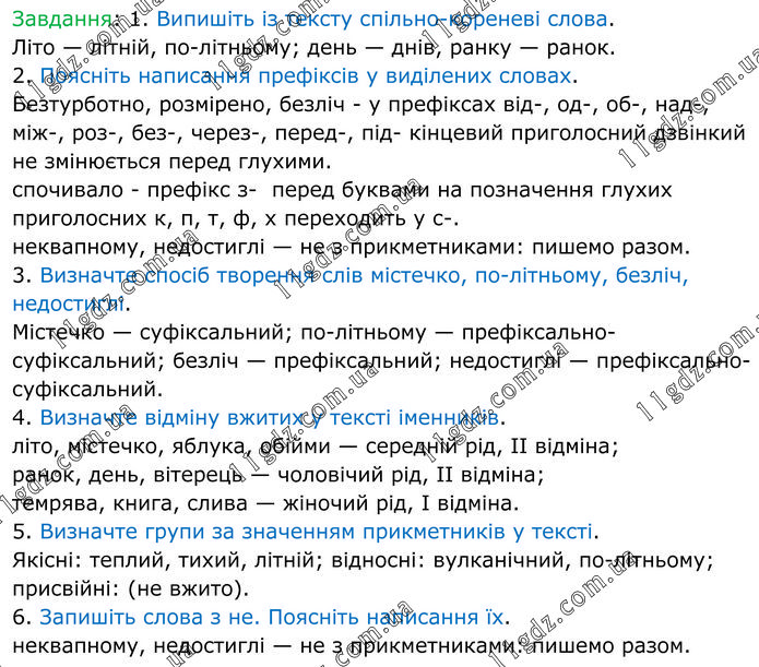 Завдання: 1. Випишіть із тексту спільно-кореневі слова. Літо — літній, по-літньому; день — днів, ранку — ранок. 2. Поясніть написання префіксів у виділених словах. Безтурботно, розмірено, безліч - у префіксах від-, од-, об-, над-, між-, роз-, без-, через-, перед-, під- кінцевий приголосний дзвінкий не змінюється перед глухими. спочивало - префікс з- перед буквами на позначення глухих приголосних к, п, т, ф, х переходить у с-. неквапному, недостиглі — не з прикметниками: пишемо разом. 3. Визначте спосіб творення слів містечко, по-літньому, безліч, недостиглі. Містечко — суфіксальний; по-літньому — префіксально-суфіксальний; безліч — префіксальний; недостиглі — префіксально-суфіксальний. 4. Визначте відміну вжитих у тексті іменників. літо, містечко, яблука, обійми — середній рід, ІІ відміна; ранок, день, вітерець — чоловічий рід, ІІ відміна; темрява, книга, слива — жіночий рід, І відміна. 5. Визначте групи за значенням прикметників у тексті. Якісні: теплий, тихий, літній; відносні: вулканічний, по-літньому; присвійні: (не вжито). 6. Запишіть слова з не. Поясніть написання їх. неквапному, недостиглі — не з прикметниками: пишемо разом.