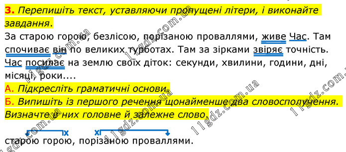3. Перепишіть текст, уставляючи пропущені літери, і виконайте завдання. За старою горою, безлісою, порізаною проваллями, живе Час. Там спочиває він по великих турботах. Там за зірками звіряє точність. Час посилає на землю своїх діток: секунди, хвилини, години, дні, місяці, роки.... А. Підкресліть граматичні основи. Б. Випишіть із першого речення щонайменше два словосполучення. Визначте в них головне й залежне слово. старою горою, порізаною проваллями.