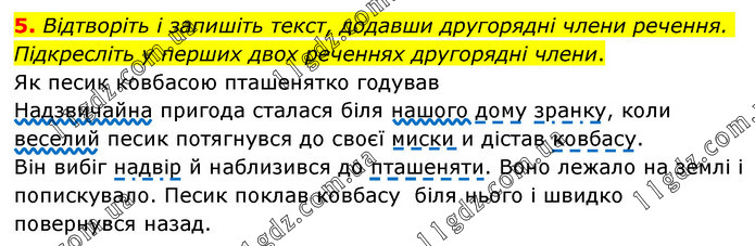 Відтворіть і запишіть текст, додавши другорядні члени речення. Підкресліть у перших двох реченнях другорядні члени. Як песик ковбасою пташенятко годував Надзвичайна пригода сталася біля нашого дому зранку, коли веселий песик потягнувся до своєї миски и дістав ковбасу. Він вибіг надвір й наблизився до пташеняти. Воно лежало на землі і попискувало. Песик поклав ковбасу біля нього і швидко повернувся назад.