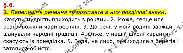 §.6. 2. Перепишіть речення та розставте в них розділові знаки. Кажуть, мудрість приходить з роками. 2. Може, серце моє розтривожили чари весняні. 3. До речі, у моїй родині завжди шанували народні традиції. 4. Отже, у нашій школі карантин скасують із понеділка. 5. Вода, на лихо, повиходила з берегів і затопила обійстя.