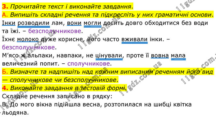 3. Прочитайте текст і виконайте завдання. А. Випишіть складні речення та підкресліть у них граматичні основи. Інки розводили лам, вони могли досить довго обходитися без води та їжі. – безсполучникове. Їхнє молоко дуже корисне, його часто вживали інки. – безсполучникове. М’ясо ж альпаки, навпаки, не цінували, проте її вовна мала величезний попит. – сполучникове. Б. Визначте та надпишіть над кожним виписаним реченням його вид — сполучникове чи безсполучникове. 4. Виконайте завдання в тестовій формі. Складне речення записано в рядку: В. До мого вікна підійшла весна, розтопилася на шибці квітка льодяна.