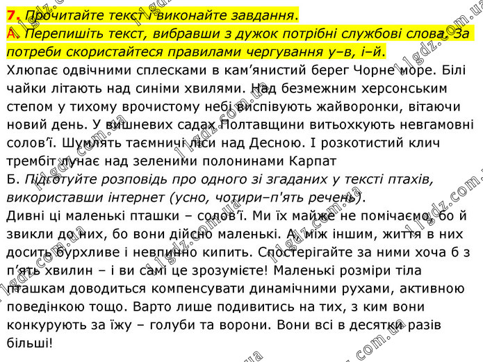 Прочитайте текст і виконайте завдання. А. Перепишіть текст, вибравши з дужок потрібні службові слова. За потреби скористайтеся правилами чергування у–в, і–й. Хлюпає одвічними сплесками в кам’янистий берег Чорне море. Білі чайки літають над синіми хвилями. Над безмежним херсонським степом у тихому врочистому небі виспівують жайворонки, вітаючи новий день. У вишневих садах Полтавщини витьохкують невгамовні солов’ї. Шумлять таємничі ліси над Десною. І розкотистий клич трембіт лунає над зеленими полонинами Карпат Б. Підготуйте розповідь про одного зі згаданих у тексті птахів, використавши інтернет (усно, чотири–п'ять речень). Дивні ці маленькі пташки – солов’ї. Ми їх майже не помічаємо, бо й звикли до них, бо вони дійсно маленькі. А, між іншим, життя в них досить бурхливе і невпинно кипить. Спостерігайте за ними хоча б з п’ять хвилин – і ви самі це зрозумієте! Маленькі розміри тіла пташкам доводиться компенсувати динамічними рухами, активною поведінкою тощо. Варто лише подивитись на тих, з ким вони конкурують за їжу – голуби та ворони. Вони всі в десятки разів більші!