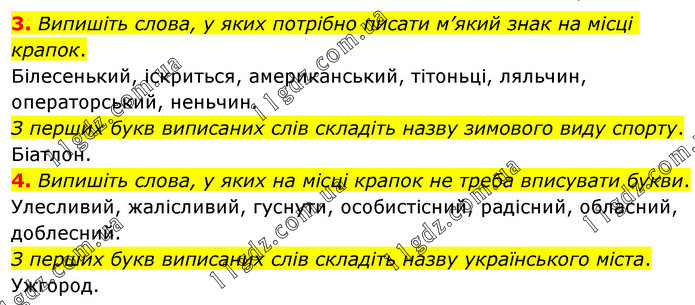3. Випишіть слова, у яких потрібно писати м’який знак на місці крапок. Білесенький, іскриться, американський, тітоньці, ляльчин, операторський, неньчин. З перших букв виписаних слів складіть назву зимового виду спорту. Біатлон. 4. Випишіть слова, у яких на місці крапок не треба вписувати букви. Улесливий, жалісливий, гуснути, особистісний, радісний, обласний, доблесний. З перших букв виписаних слів складіть назву українського міста. Ужгород.