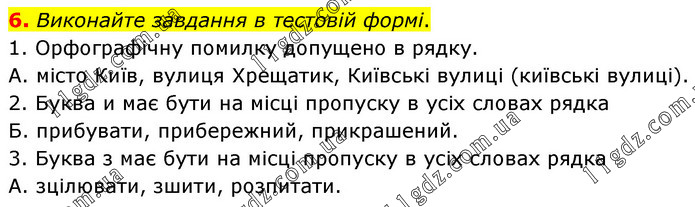 6. Виконайте завдання в тестовій формі. 1. Орфографічну помилку допущено в рядку. А. місто Київ, вулиця Хрещатик, Київські вулиці (київські вулиці). 2. Буква и має бути на місці пропуску в усіх словах рядка Б. прибувати, прибережний, прикрашений. 3. Буква з має бути на місці пропуску в усіх словах рядка А. зцілювати, зшити, розпитати.