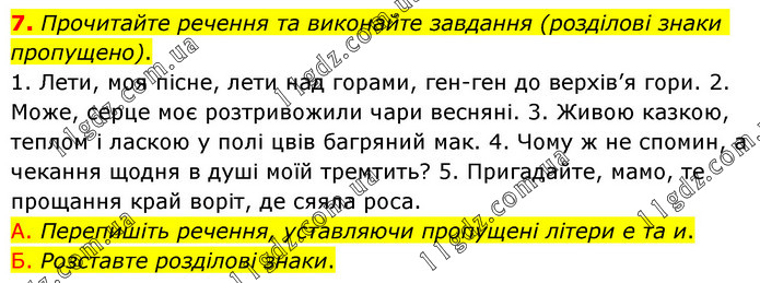 7. Прочитайте речення та виконайте завдання (розділові знаки пропущено). 1. Лети, моя пісне, лети над горами, ген-ген до верхів’я гори. 2. Може, серце моє розтривожили чари весняні. 3. Живою казкою, теплом і ласкою у полі цвів багряний мак. 4. Чому ж не спомин, а чекання щодня в душі моїй тремтить? 5. Пригадайте, мамо, те прощання край воріт, де сяяла роса. А. Перепишіть речення, уставляючи пропущені літери е та и. Б. Розставте розділові знаки.