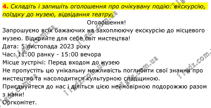 4. Складіть і запишіть оголошення про очікувану подію: екскурсію, поїздку до музею, відвідання театру. Оголошення! Запрошуємо всіх бажаючих на захоплюючу екскурсію до місцевого музею. Відкрийте для себе світ мистецтва! Дата: 5 листопада 2023 року Час: 11:00 ранку - 15:00 вечора Місце зустрічі: Перед входом до музею Не пропустіть цю унікальну можливість поглибити свої знання про мистецтво та насолодитися культурною спадщиною. Приєднуйтеся до нас і діліться цією неймовірною подорожжю разом з нами! Оргкомітет.