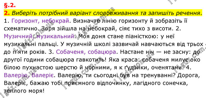 §.2. 2. Виберіть потрібний варіант слововживання та запишіть речення. 1. Горизонт, небокрай. Визначте лінію горизонту й зобразіть її схематично. Зоря зійшла на небокрай, сіяє тихо з висоти. 2. Музичний, музикальний. Моя доня ста¬не піаністкою: у неї музикальні пальці. У музичній школі зазвичай навчаються від трьох до п’яти років. 3. Собаченя, собацюра. Настане ніч — не засну: до другої години собацюра гавкотить! Яка краса: собаченя милує око білою пухнастою шерстю й чорними, я к ґудзики, оченятами. 4. Валерію, Валеріє. Валерію, ти сьогодні був на тренуванні? Дорога, Валеріє, бажаю тобі приємного відпочинку, лагідного сонечка, теплого моря!