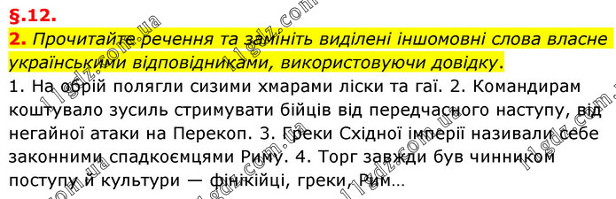§.12. 2. Прочитайте речення та замініть виділені іншомовні слова власне українськими відповідниками, використовуючи довідку. 1. На обрій полягли сизими хмарами ліски та гаї. 2. Командирам коштувало зусиль стримувати бійців від передчасного наступу, від негайної атаки на Перекоп. 3. Греки Східної імперії називали себе законними спадкоємцями Риму. 4. Торг завжди був чинником поступу й культури — фінікійці, греки, Рим…