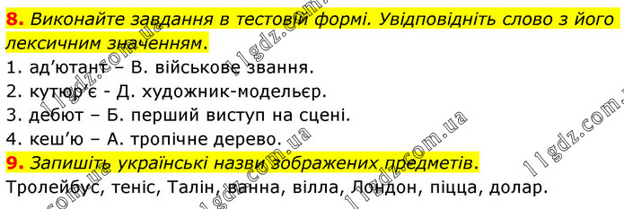 8. Виконайте завдання в тестовій формі. Увідповідніть слово з його лексичним значенням. 1. ад’ютант – В. військове звання. 2. кутюр’є - Д. художник-модельєр. 3. дебют – Б. перший виступ на сцені. 4. кеш’ю – А. тропічне дерево. 9. Запишіть українські назви зображених предметів. Тролейбус, теніс, Талін, ванна, вілла, Лондон, піцца, долар.
