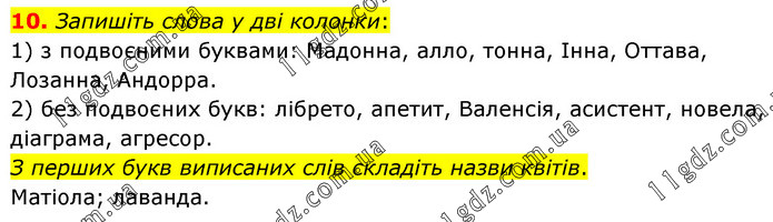 10. Запишіть слова у дві колонки: 1) з подвоєними буквами: Мадонна, алло, тонна, Інна, Оттава, Лозанна, Андорра. 2) без подвоєних букв: лібрето, апетит, Валенсія, асистент, новела, діаграма, агресор. З перших букв виписаних слів складіть назви квітів. Матіола; лаванда.