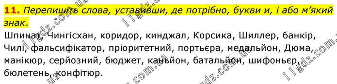 Перепишіть слова, уставивши, де потрібно, букви и, і або м’який знак. Шпинат, Чингісхан, коридор, кинджал, Корсика, Шиллер, банкір, Чилі, фальсифікатор, пріоритетний, портьєра, медальйон, Дюма, манікюр, серйозний, бюджет, каньйон, батальйон, шифоньєр, бюлетень, конфітюр.