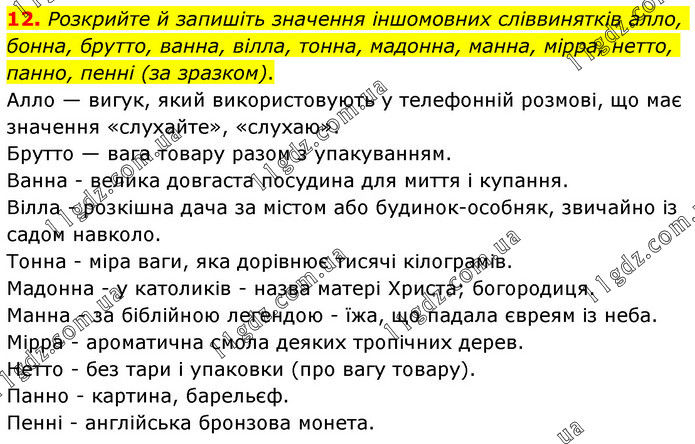 Розкрийте й запишіть значення іншомовних сліввинятків алло, бонна, брутто, ванна, вілла, тонна, мадонна, манна, мірра, нетто, панно, пенні (за зразком). Алло — вигук, який використовують у телефонній розмові, що має значення «слухайте», «слухаю». Брутто — вага товару разом з упакуванням. Ванна - велика довгаста посудина для миття і купання. Вілла - розкішна дача за містом або будинок-особняк, звичайно із садом навколо. Тонна - міра ваги, яка дорівнює тисячі кілограмів. Мадонна - у католиків - назва матері Христа; богородиця. Манна - за біблійною легендою - їжа, що падала євреям із неба. Мірра - ароматична смола деяких тропічних дерев. Нетто - без тари і упаковки (про вагу товару). Панно - картина, барельєф. Пенні - англійська бронзова монета.