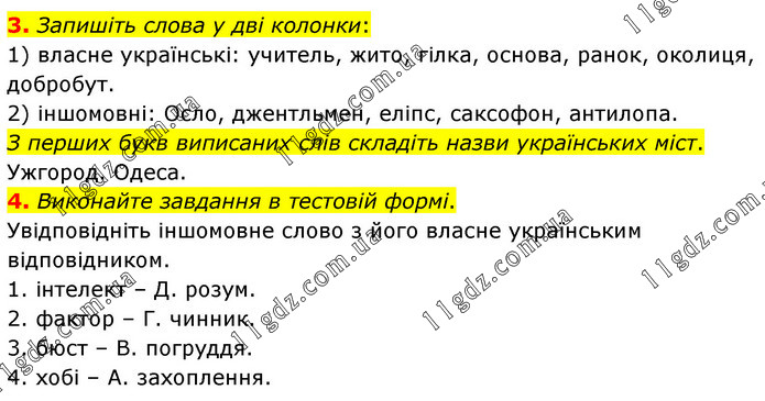 3. Запишіть слова у дві колонки: 1) власне українські: учитель, жито, гілка, основа, ранок, околиця, добробут. 2) іншомовні: Осло, джентльмен, еліпс, саксофон, антилопа. З перших букв виписаних слів складіть назви українських міст. Ужгород. Одеса. 4. Виконайте завдання в тестовій формі. Увідповідніть іншомовне слово з його власне українським відповідником. 1. інтелект – Д. розум. 2. фактор – Г. чинник. 3. бюст – В. погруддя. 4. хобі – А. захоплення.