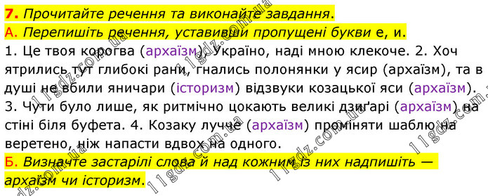 7. Прочитайте речення та виконайте завдання. А. Перепишіть речення, уставивши пропущені букви е, и. 1. Це твоя корогва (архаїзм), Україно, наді мною клекоче. 2. Хоч ятрились тут глибокі рани, гнались полонянки у ясир (архаїзм), та в душі не вбили яничари (історизм) відзвуки козацької яси (архаїзм). 3. Чути було лише, як ритмічно цокають великі дзиґарі (архаїзм) на стіні біля буфета. 4. Козаку лучче (архаїзм) проміняти шаблю на веретено, ніж напасти вдвох на одного. Б. Визначте застарілі слова й над кожним із них надпишіть — архаїзм чи історизм.
