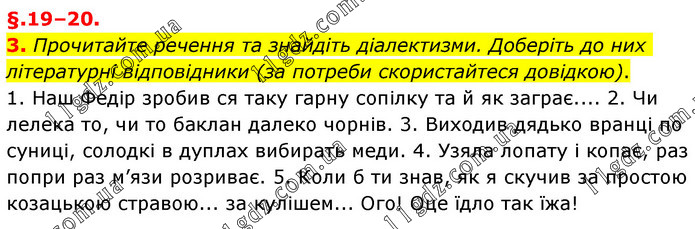 §.19–20. 3. Прочитайте речення та знайдіть діалектизми. Доберіть до них літературні відповідники (за потреби скористайтеся довідкою). 1. Наш Федір зробив ся таку гарну сопілку та й як заграє.... 2. Чи лелека то, чи то баклан далеко чорнів. 3. Виходив дядько вранці по суниці, солодкі в дуплах вибирать меди. 4. Узяла лопату і копає, раз попри раз м’язи розриває. 5. Коли б ти знав, як я скучив за простою козацькою стравою... за кулішем... Ого! Оце їдло так їжа!