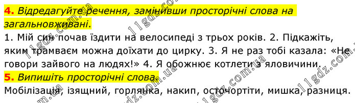 4. Відредагуйте речення, замінивши просторічні слова на загальновживані. 1. Мій син почав їздити на велосипеді з трьох років. 2. Підкажіть, яким трамваєм можна доїхати до цирку. 3. Я не раз тобі казала: «Не говори зайвого на людях!» 4. Я обожнює котлети з яловичини. 5. Випишіть просторічні слова. Мобілізація, ізящний, горлянка, накип, осточортіти, мишка, разниця