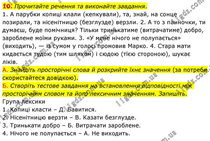 10. Прочитайте речення та виконайте завдання. 1. А парубки копиці клали (кепкували), та, знай, на сонце позирали, та нісенітницю (безглузде) верзли. 2. А то з панночки, ти думаєш, буде помічниця? Тільки тринькатиме (витрачатиме) добро, зароблене моїми руками. 3. «У мене нічого не полупається» (виходить), — із сумом у голосі промовив Марко. 4. Стара мати кидається тудою (тим шляхом) і сюдою (тїєю стороною), шукає ліків. А. Знайдіть просторічні слова й розкрийте їхнє значення (за потреби скористайтеся довідкою). Б. Створіть тестове завдання на встановлення відповідності між просторічним словом та його лексичним значенням. Запишіть. Група лексики 1. Копиці класти – Д. Бавитися. 2. Нісенітницю верзти – В. Казати безглузде. 3. Тринькати добро – Б. Витрачати зароблене. 4. Нічого не полупається – А. Не виходить.