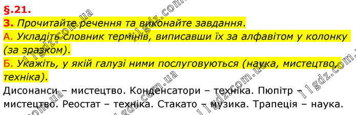 §.21. 3. Прочитайте речення та виконайте завдання. А. Укладіть словник термінів, виписавши їх за алфавітом у колонку (за зразком). Б. Укажіть, у якій галузі ними послуговуються (наука, мистецтво, техніка). Дисонанси – мистецтво. Конденсатори – техніка. Пюпітр – мистецтво. Реостат – техніка. Стакато – музика. Трапеція – наука.