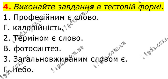 4. Виконайте завдання в тестовій формі. 1. Професійним є слово. Г. калорійність. 2. Терміном є слово. В. фотосинтез. 3. Загальновживаним словом є. Г. небо.