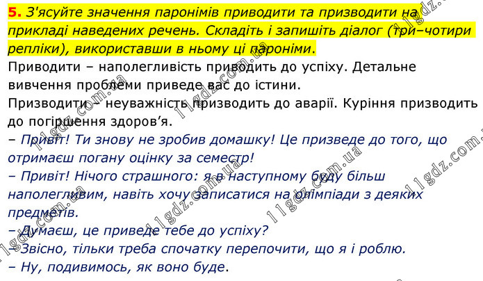 5. З'ясуйте значення паронімів приводити та призводити на прикладі наведених речень. Складіть і запишіть діалог (три–чотири репліки), використавши в ньому ці пароніми. Приводити – наполегливість приводить до успіху. Детальне вивчення проблеми приведе вас до істини. Призводити – неуважність призводить до аварії. Куріння призводить до погіршення здоров’я. – Привіт! Ти знову не зробив домашку! Це призведе до того, що отримаєш погану оцінку за семестр! – Привіт! Нічого страшного: я в наступному буду більш наполегливим, навіть хочу записатися на олімпіади з деяких предметів. – Думаєш, це приведе тебе до успіху? – Звісно, тільки треба спочатку перепочити, що я і роблю. – Ну, подивимось, як воно буде.