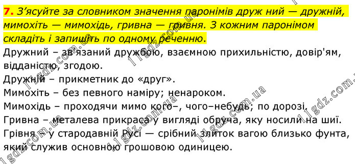 З’ясуйте за словником значення паронімів друж ний — дружній, мимохіть — мимохідь, гривна — гривня. З кожним паронімом складіть і запишіть по одному реченню. Дружний – зв'язаний дружбою, взаємною прихильністю, довір'ям, відданістю, згодою. Дружній – прикметник до «друг». Мимохіть – без певного наміру; ненароком. Мимохідь – проходячи мимо кого–, чого–небудь; по дорозі. Гривна – металева прикраса у вигляді обруча, яку носили на шиї. Грівня – у стародавній Русі — срібний злиток вагою близько фунта, який служив основною грошовою одиницею.
