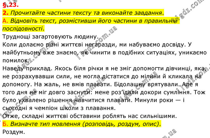 §.23. 2. Прочитайте частини тексту та виконайте завдання. А. Відновіть текст, розмістивши його частини в правильній послідовності. Труднощі загартовують людину. Коли долаємо різні життєві негаразди, ми набуваємо досвіду. У майбутньому вже знаємо, як чинити в подібних ситуаціях, уникаємо помилок. Наведу приклад. Якось біля річки я не зміг допомогти дівчинці, яка, не розрахувавши сили, не могла дістатися до мілини й кликала на допомогу. На жаль, не вмів плавати. Бідолашну врятували. Але я того дня не міг довго заснути: мене роз’їдали докори сумління. Тож було ухвалено рішення навчитися плавати. Минули роки — і сьогодні я чемпіон школи з плавання. Отже, складні життєві обставини роблять нас сильнішими. Б. Визначте тип мовлення (розповідь, роздум, опис). Роздум.