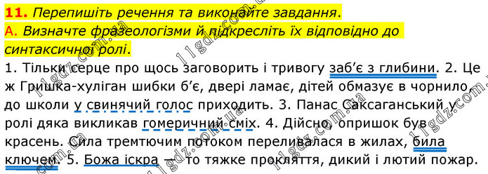 Перепишіть речення та виконайте завдання. А. Визначте фразеологізми й підкресліть їх відповідно до синтаксичної ролі. 1. Тільки серце про щось заговорить і тривогу заб’є з глибини. 2. Це ж Гришка-хуліган шибки б’є, двері ламає, дітей обмазує в чорнило, до школи у свинячий голос приходить. 3. Панас Саксаганський у ролі дяка викликав гомеричний сміх. 4. Дійсно, опришок був красень. Сила тремтючим потоком переливалася в жилах, била ключем. 5. Божа іскра — то тяжке прокляття, дикий і лютий пожар.