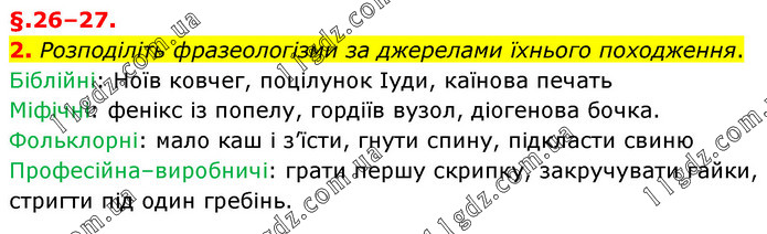 §.26–27. 2. Розподіліть фразеологізми за джерелами їхнього походження. Біблійні: Ноїв ковчег, поцілунок Іуди, каїнова печать Міфічні: фенікс із попелу, гордіїв вузол, діогенова бочка. Фольклорні: мало каш і з’їсти, гнути спину, підкласти свиню Професійна–виробничі: грати першу скрипку, закручувати гайки, стригти під один гребінь.