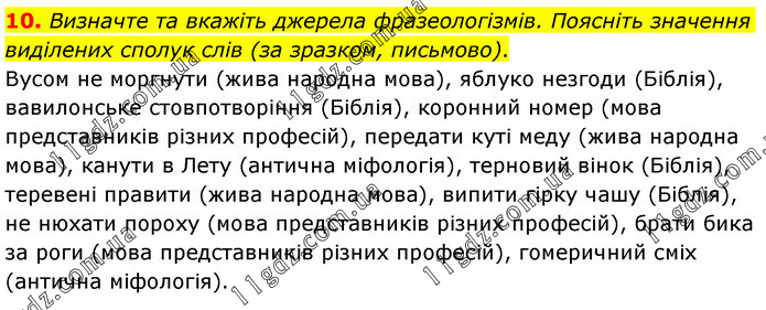 10. Визначте та вкажіть джерела фразеологізмів. Поясніть значення виділених сполук слів (за зразком, письмово). Вусом не моргнути (жива народна мова), яблуко незгоди (Біблія), вавилонське стовпотворіння (Біблія), коронний номер (мова представників різних професій), передати куті меду (жива народна мова), канути в Лету (антична міфологія), терновий вінок (Біблія), теревені правити (жива народна мова), випити гірку чашу (Біблія), не нюхати пороху (мова представників різних професій), брати бика за роги (мова представників різних професій), гомеричний сміх (антична міфологія).