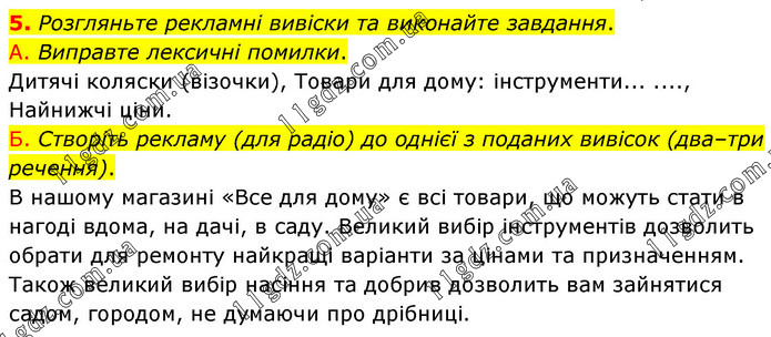 5. Розгляньте рекламні вивіски та виконайте завдання. А. Виправте лексичні помилки. Дитячі коляски (візочки), Товари для дому: інструменти... ...., Найнижчі ціни. Б. Створіть рекламу (для радіо) до однієї з поданих вивісок (два–три речення). В нашому магазині «Все для дому» є всі товари, що можуть стати в нагоді вдома, на дачі, в саду. Великий вибір інструментів дозволить обрати для ремонту найкращі варіанти за цінами та призначенням. Також великий вибір насіння та добрив дозволить вам зайнятися садом, городом, не думаючи про дрібниці.