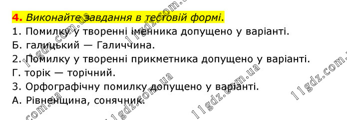 Виконайте завдання в тестовій формі. 1. Помилку у творенні іменника допущено у варіанті. Б. галицький — Галиччина. 2. Помилку у творенні прикметника допущено у варіанті. Г. торік — торічний. 3. Орфографічну помилку допущено у варіанті. А. Рівненщина, сонячник.