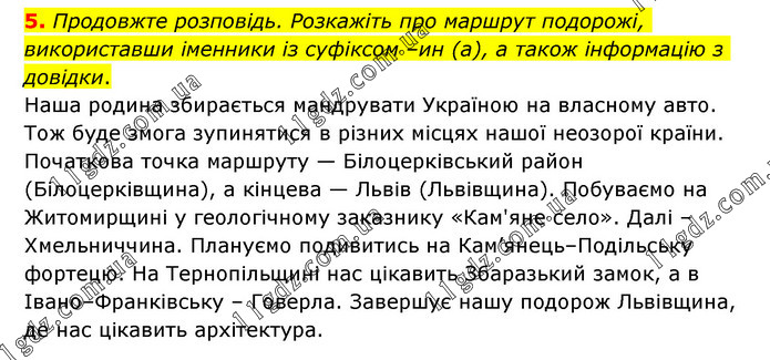 Продовжте розповідь. Розкажіть про маршрут подорожі, використавши іменники із суфіксом –ин (а), а також інформацію з довідки. Наша родина збирається мандрувати Україною на власному авто. Тож буде змога зупинятися в різних місцях нашої неозорої країни. Початкова точка маршруту — Білоцерківський район (Білоцерківщина), а кінцева — Львів (Львівщина). Побуваємо на Житомирщині у геологічному заказнику «Кам'яне село». Далі – Хмельниччина. Плануємо подивитись на Кам’янець–Подільську фортецю. На Тернопільщині нас цікавить Збаразький замок, а в Івано–Франківську – Говерла. Завершує нашу подорож Львівщина, де нас цікавить архітектура.