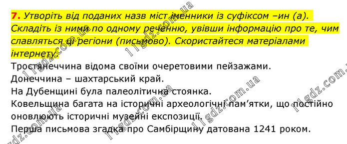 Утворіть від поданих назв міст іменники із суфіксом –ин (а). Складіть із ними по одному реченню, увівши інформацію про те, чим славляться ці регіони (письмово). Скористайтеся матеріалами інтернету. Тростянеччина відома своїми очеретовими пейзажами. Донеччина – шахтарський край. На Дубенщині була палеолітична стоянка. Ковельщина багата на історичні археологічні пам’ятки, що постійно оновлюють історичні музейні експозиції. Перша письмова згадка про Самбірщину датована 1241 роком.