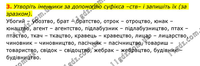 Утворіть іменники за допомогою суфікса –ств– і запишіть їх (за зразком). Убогий – убозтво, брат – братство, отрок – отроцтво, юнак – юнацтво, агент – агентство, підлабузник – підлабузництво, птах – птаство, ткач – ткацтво, кравець – кравецтво, лицар – лицарство, чиновник – чиновництво, пасічник – пасічництво, товариш – товариство, свідок – свідоцтво, жебрак – жебрацтво, будівник – будівництво.