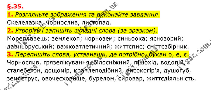 §.35. 1. Розгляньте зображення та виконайте завдання. Скелелазка, чорнослив, листопад. 2. Утворіть і запишіть складні слова (за зразком). Мореплавець; землекоп; чорнозем; синьоока; яснозорий; давньоруський; важкоатлетичний; життєпис; сміттєзбірник. 3. Перепишіть слова, уставивши, де потрібно, букви о, е, є. Чорнослив, грязелікування, білосніжний, пішохід, водопій, сталебетон, дощомір, краплеподібний, високогір’я, душогуб, землетрус, овочесховище, бурелом, сировар, життєдіяльність.