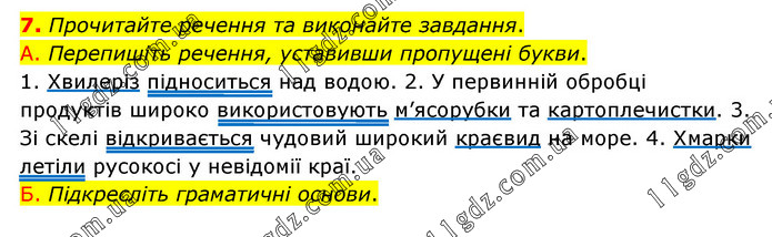 Прочитайте речення та виконайте завдання. А. Перепишіть речення, уставивши пропущені букви. 1. Хвилеріз підноситься над водою. 2. У первинній обробці продуктів широко використовують м’ясорубки та картоплечистки. 3. Зі скелі відкривається чудовий широкий краєвид на море. 4. Хмарки летіли русокосі у невідомії краї. Б. Підкресліть граматичні основи.